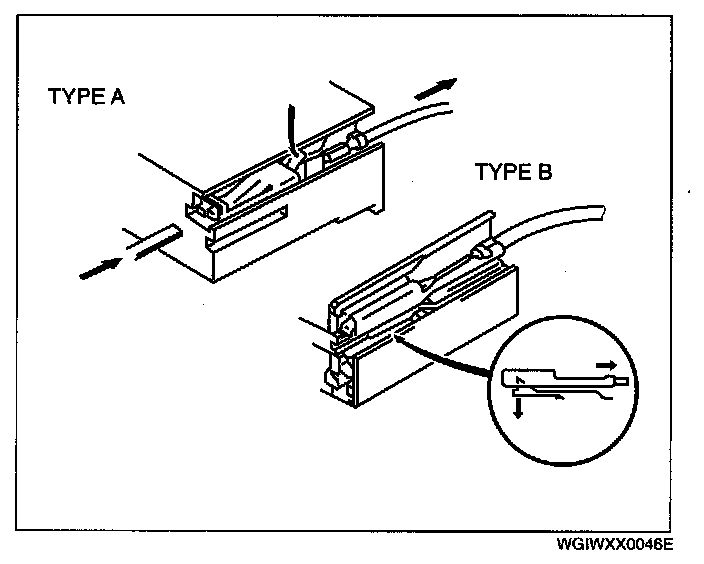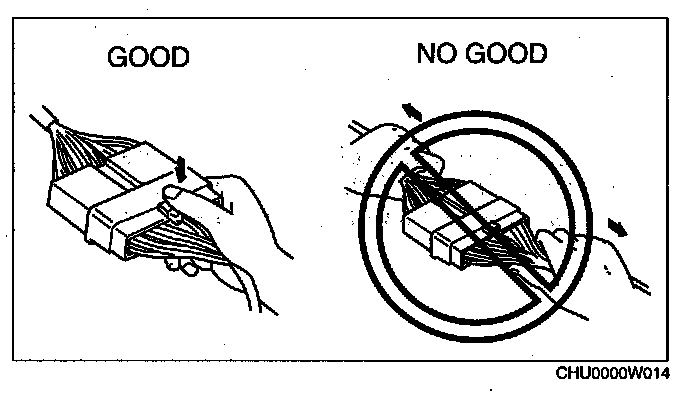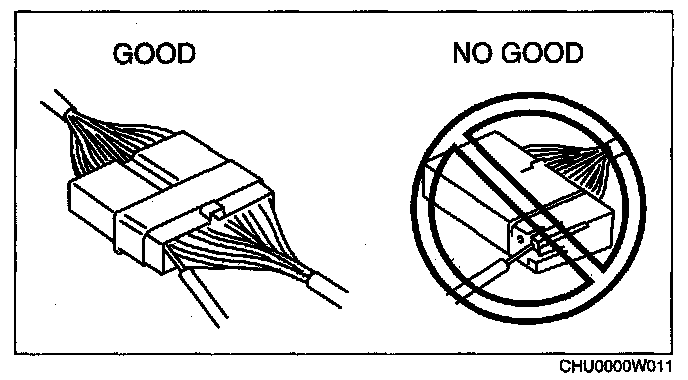 - When a tester is used to inspect for continuity or measuring voltage, insert the tester probe from the wiring harness side.
