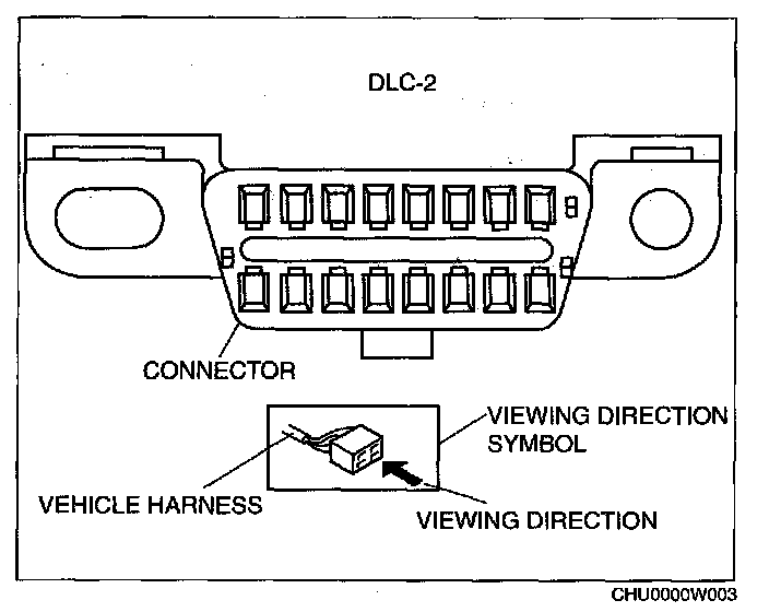 When it is necessary to show the terminal side of vehicle harness-side connectors, such as the following connectors, the viewing direction is from the DLC 2 terminal side.