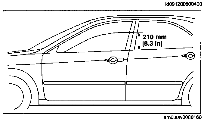 FRONT DOOR GLASS REMOVAL/INSTALLATION1. Operate the front door glass so that the distance from the top of the front door glass to the upper part of the front beltline molding is 210 mm {8.3 in}.