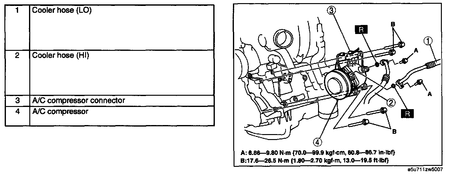 7. Do not allow remaining compressor oil in the A/C compressor and pipes to spill, and remove in the order indicated in the table.