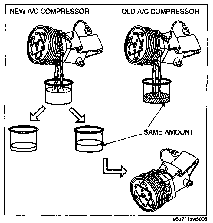1. Rotate new A/C compressor shaft six to eight revolutions while draining new refrigerant oil in a clean measuring device. Use this refrigerant oil to refill new compressor. Do not allow refrigerant oil to become contaminated.