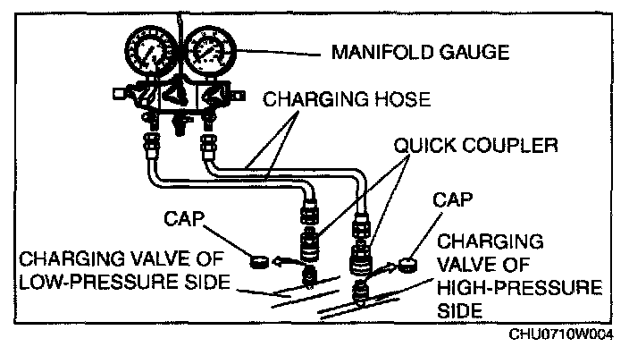 2. Connect the charging hoses to the high/low pressure side joints of the manifold gauge.