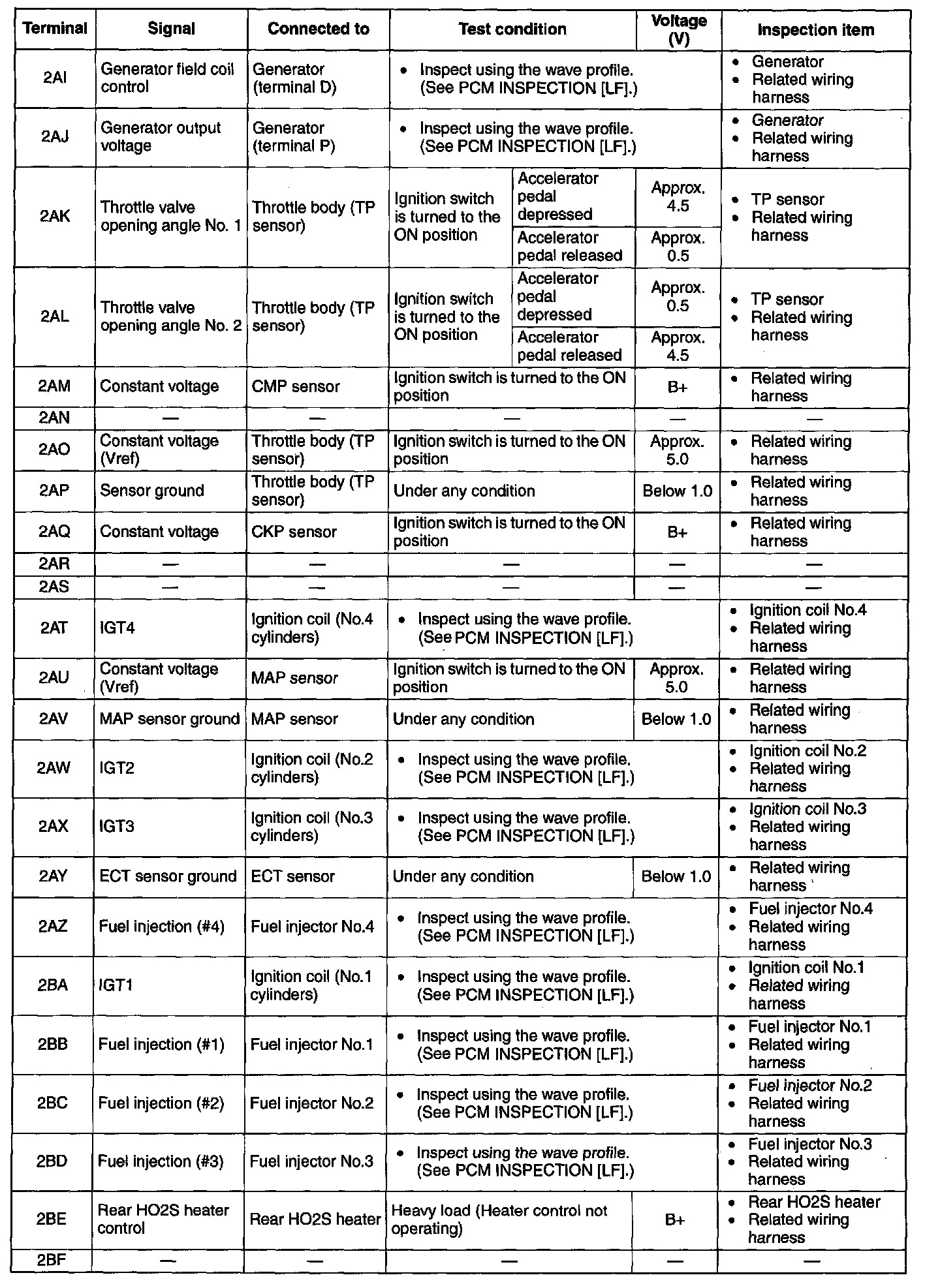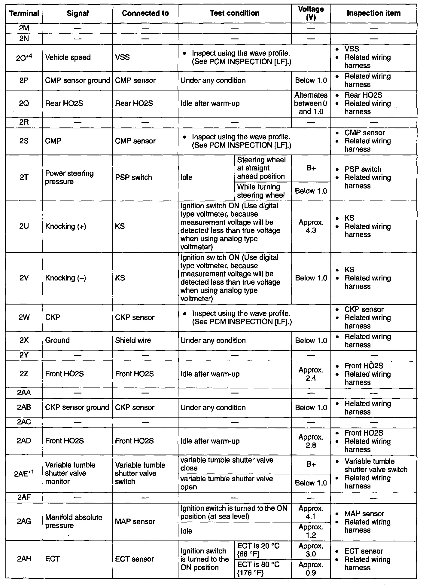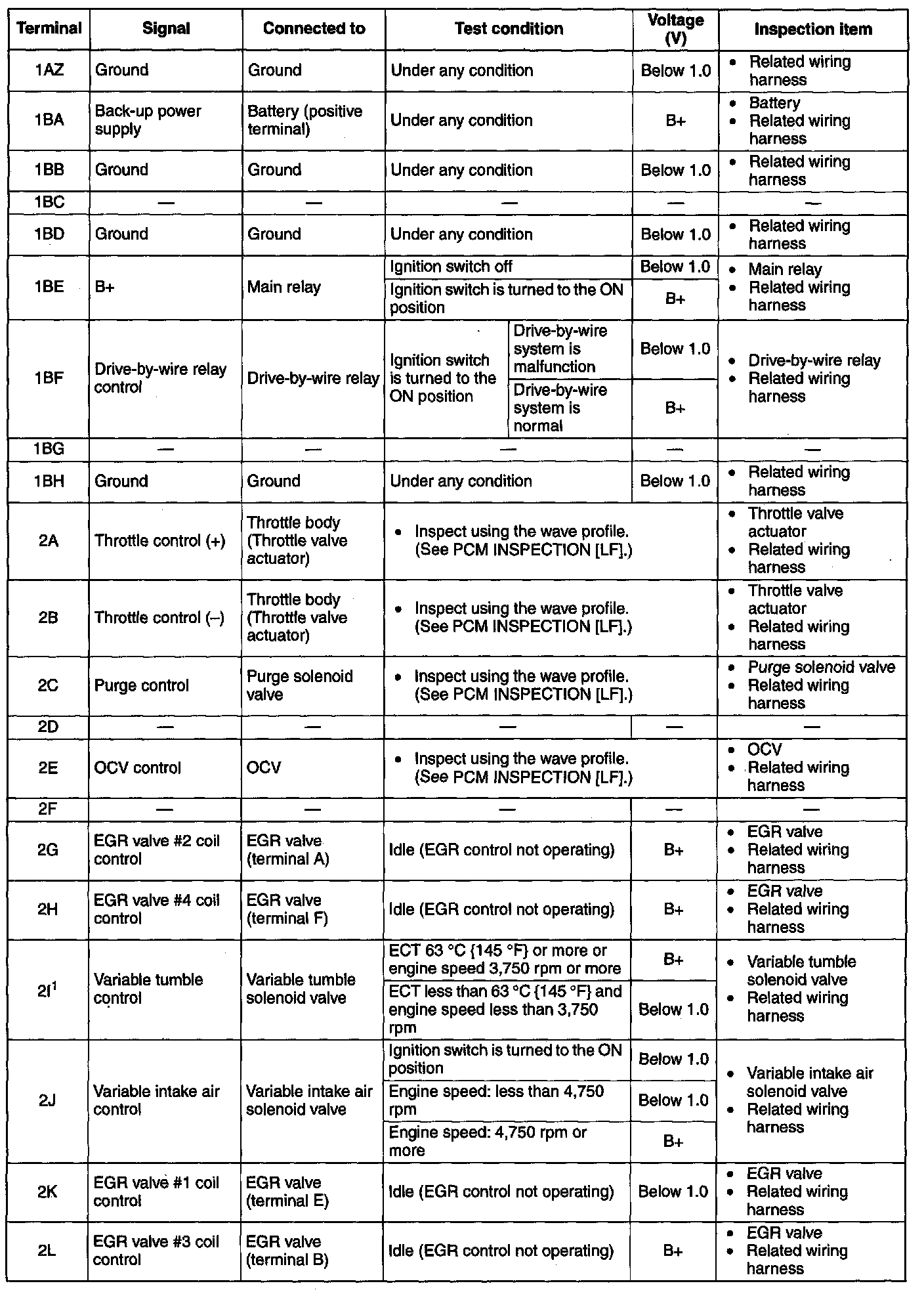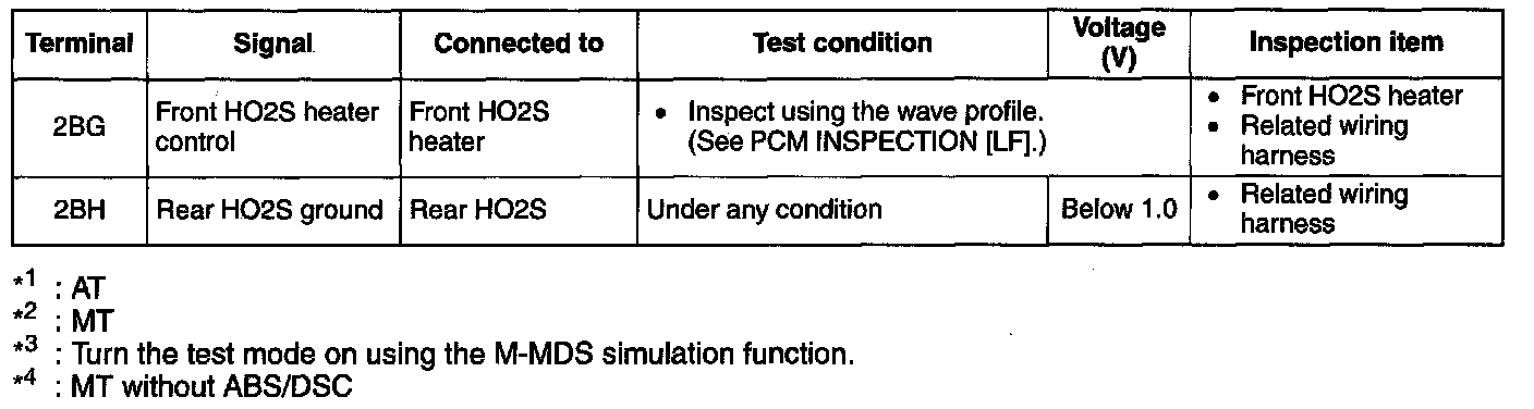 NOTE: The PCM terminal voltage can vary with the conditions when measuring and changes due to aged deterioration on the vehicle, causing false diagnosis. Therefore determine comprehensively where the malfunction occurs among the input systems, output systems, and the PCM.