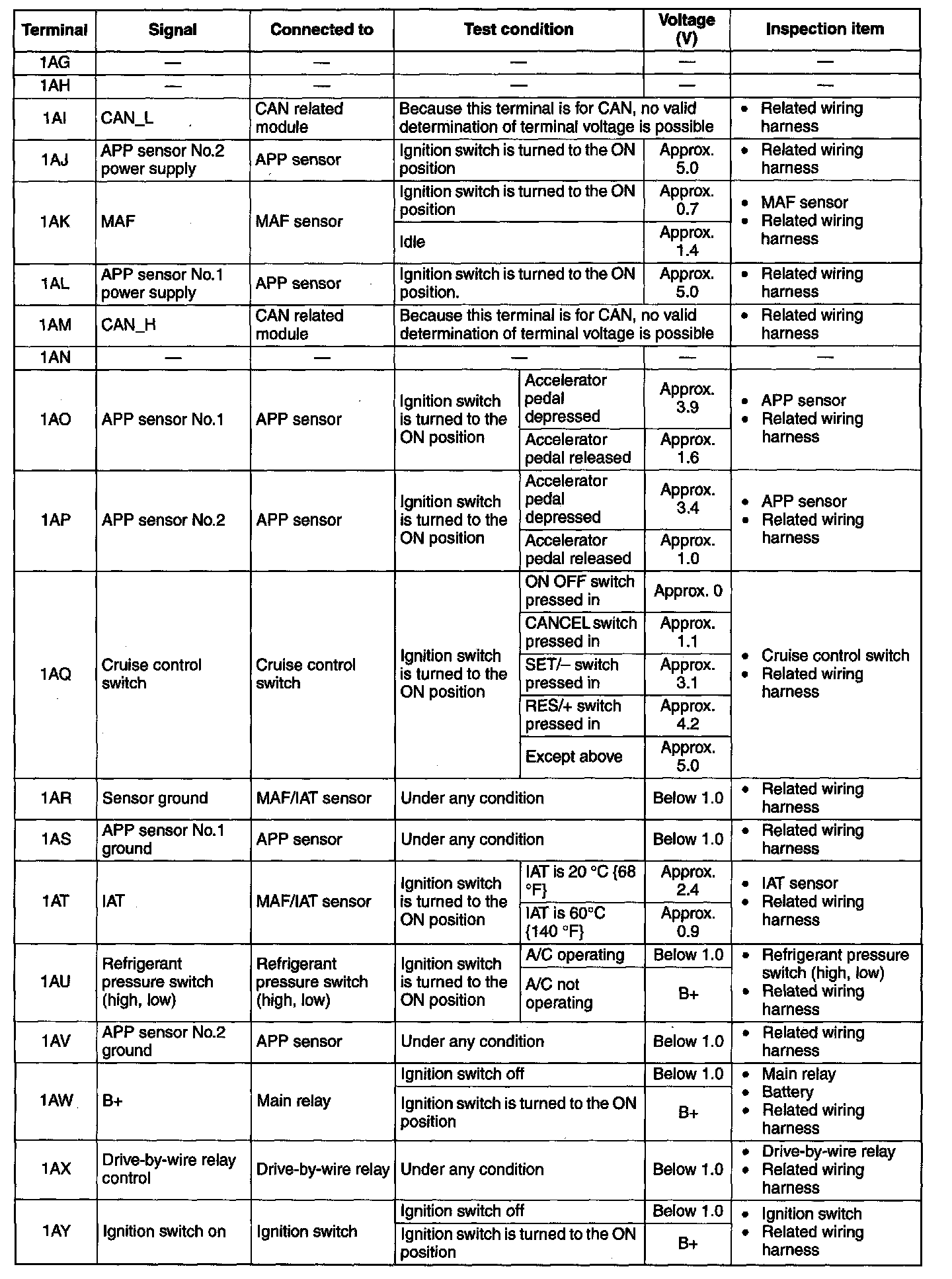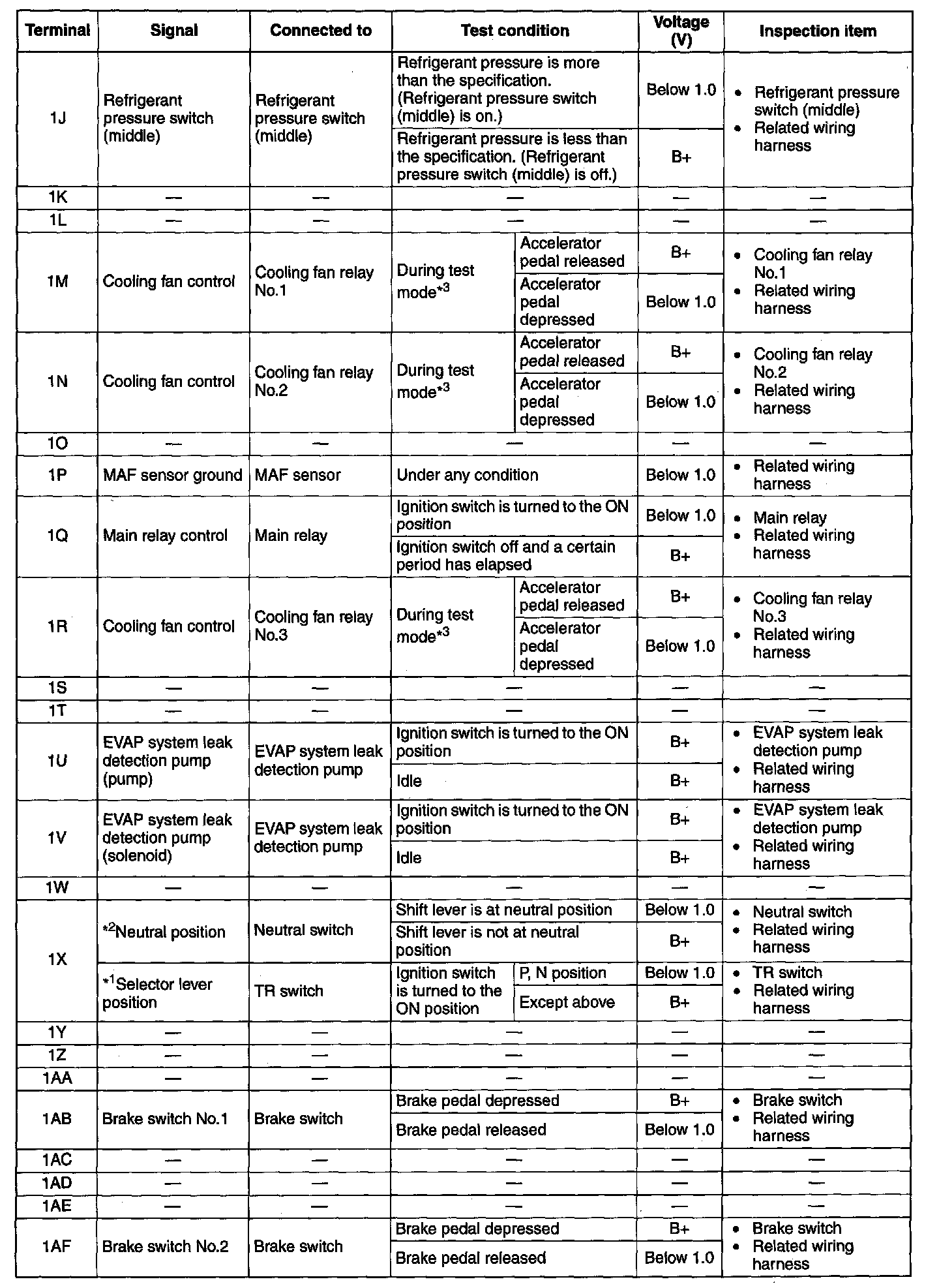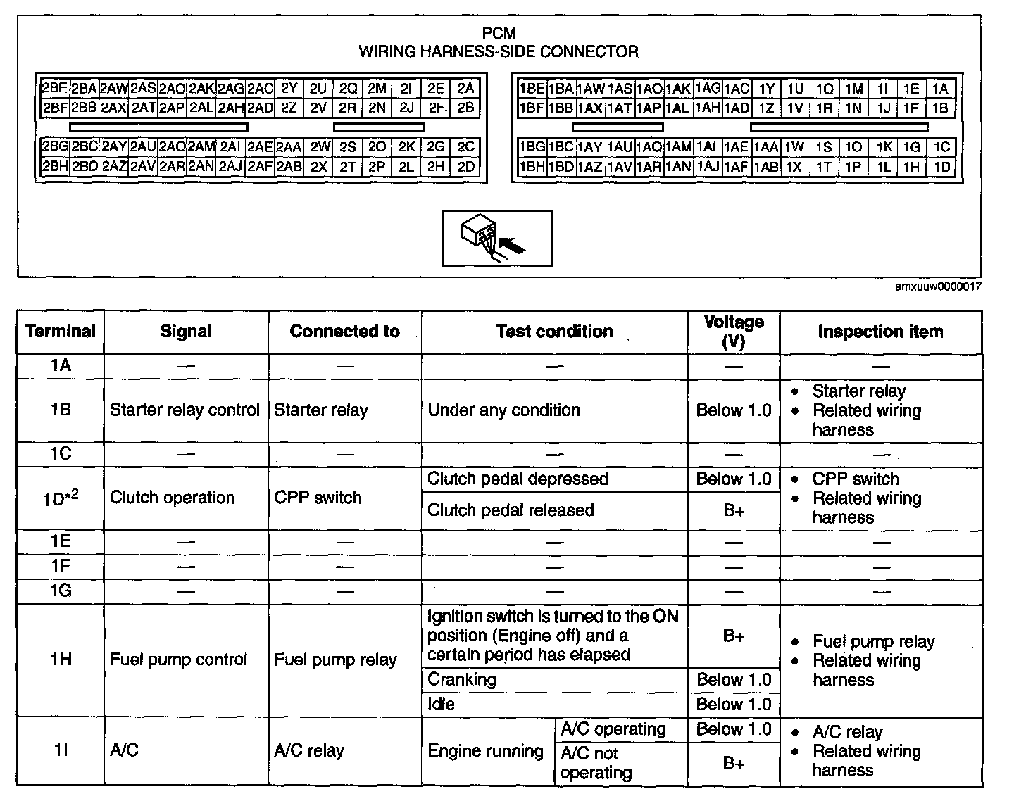 NOTE: The PCM terminal voltage can vary with the conditions when measuring and changes due to aged deterioration on the vehicle, causing false diagnosis. Therefore determine comprehensively where the malfunction occurs among the input systems, output systems, and the PCM.