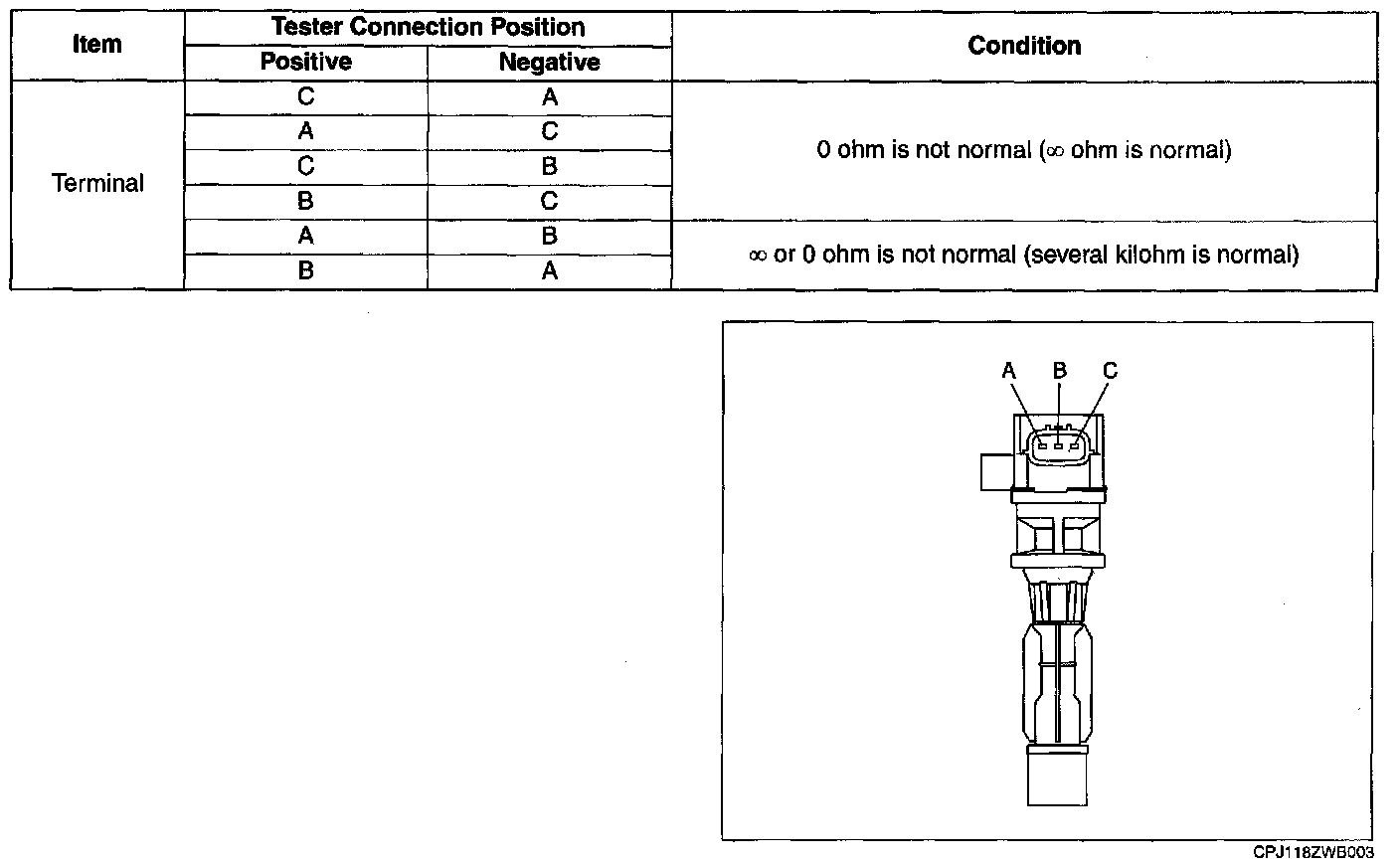 2. Measure the resistance between each terminal on the ignition coil connector using an analog circuit tester.