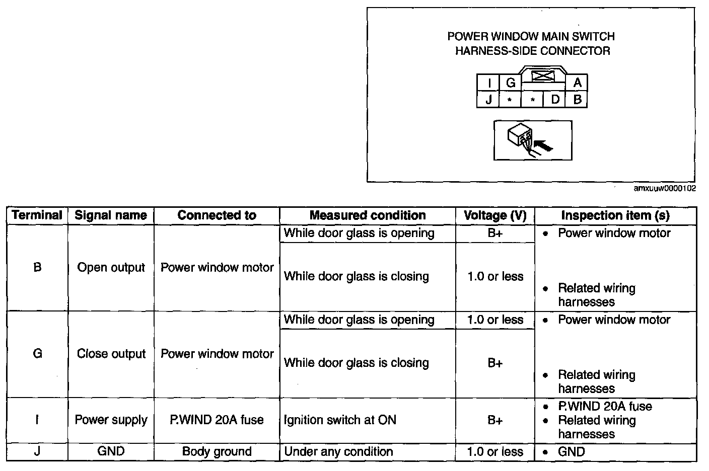 - If not as indicated in the table, replace the power window main switch.
