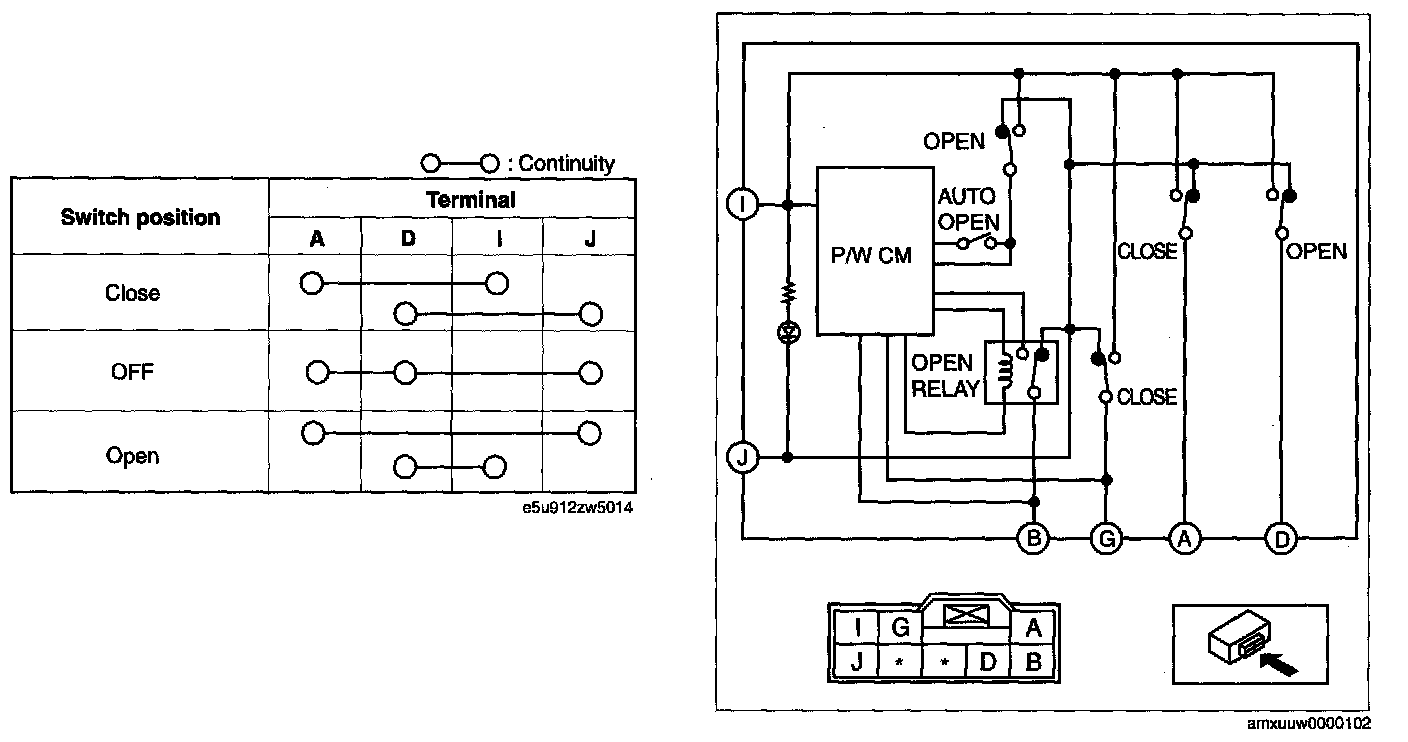 1. Verify that the continuity between the power window main switch terminals is as indicated in the table.