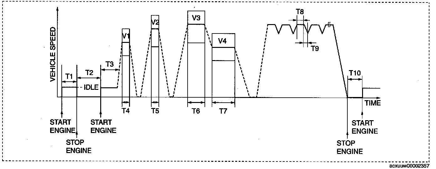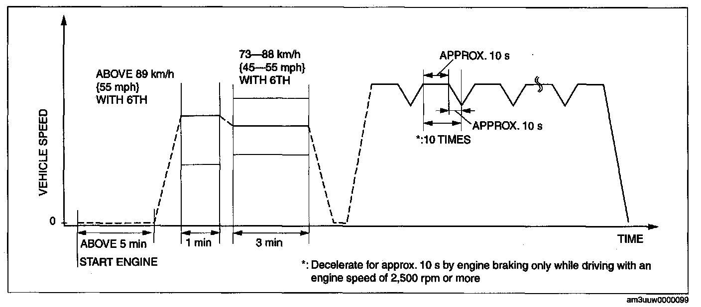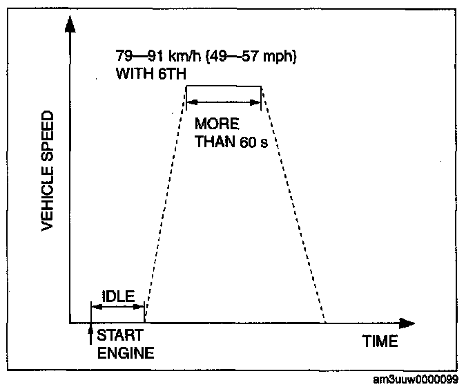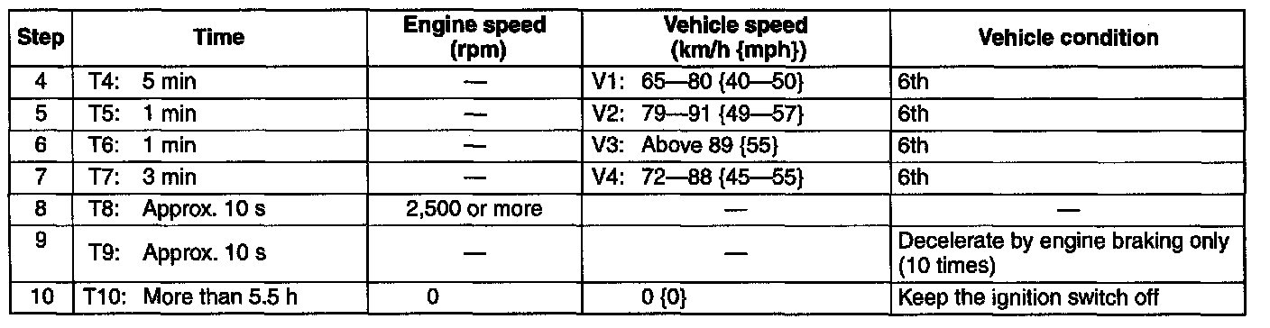 6. Drive the vehicle at an engine speed of 65-80 km/h {40-50 mph} for more than 5 min.