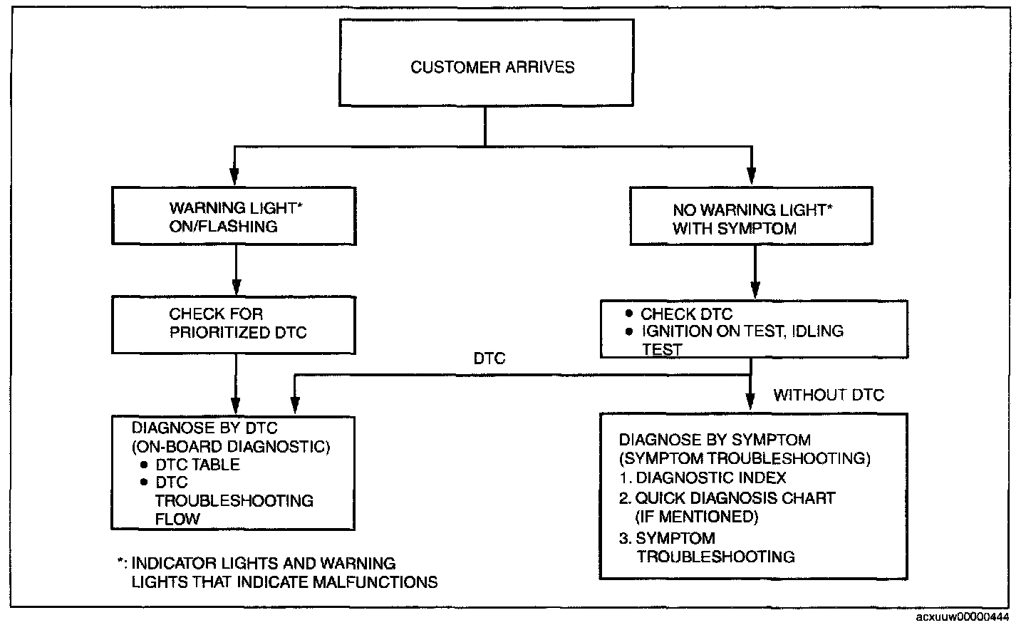 - The quick diagnosis chart lists diagnosis and inspection procedures to be performed specifically relating to the cause of the malfunction.