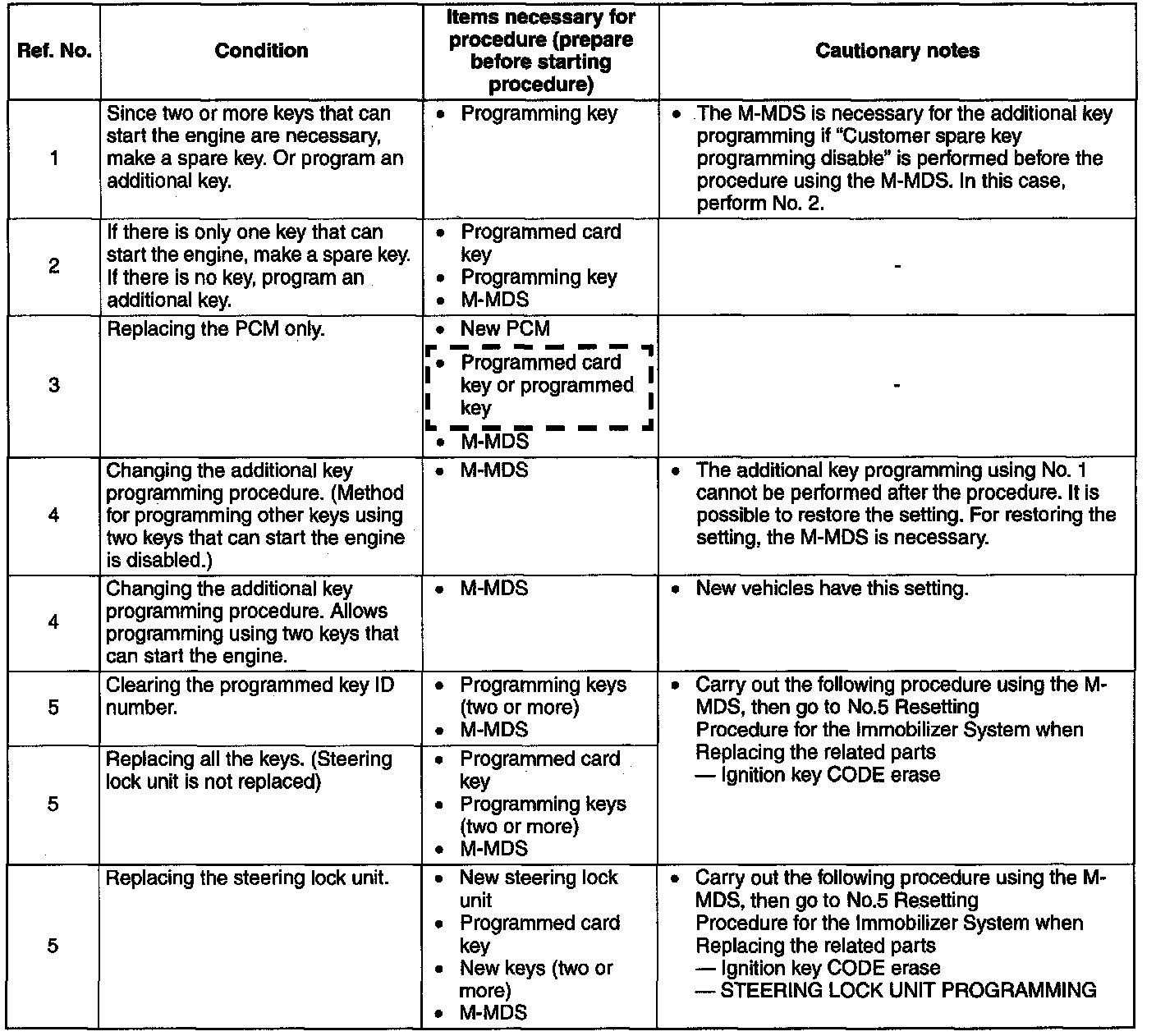 - When performing the following procedures, the immobilizer resetting procedure using the M-MDS must also always be performed: "Keyless control module replacement", "PCM replacement", "Steering lock unit replacement", "Keyless control module and PCM joint replacement", "Keyless control module, PCM, and steering lock unit joint replacement", and "Key ID number clearing". The engine will not start unless all work is performed using the M-MDS.