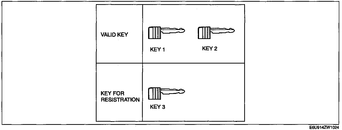 - If eight keys have already been programmed, and it is necessary to program other keys, the previously programmed key ID numbers must first be cleared. To clear the key, refer to "No.3 PCM Replacement Procedure".