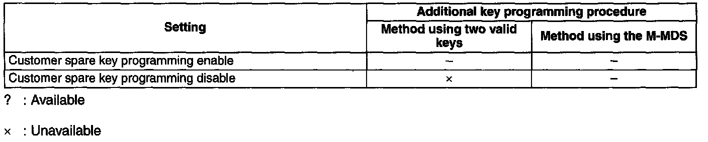 - If "No.1 Additional Key Programming Procedure (Using Two Valid Keys)" is set to disable, the additional key programming can be only performed using the M-MDS preventing the forging of a spare key by using two keys that can start the engine. This function is for use by rental car agencies or other companies with vehicle fleets.