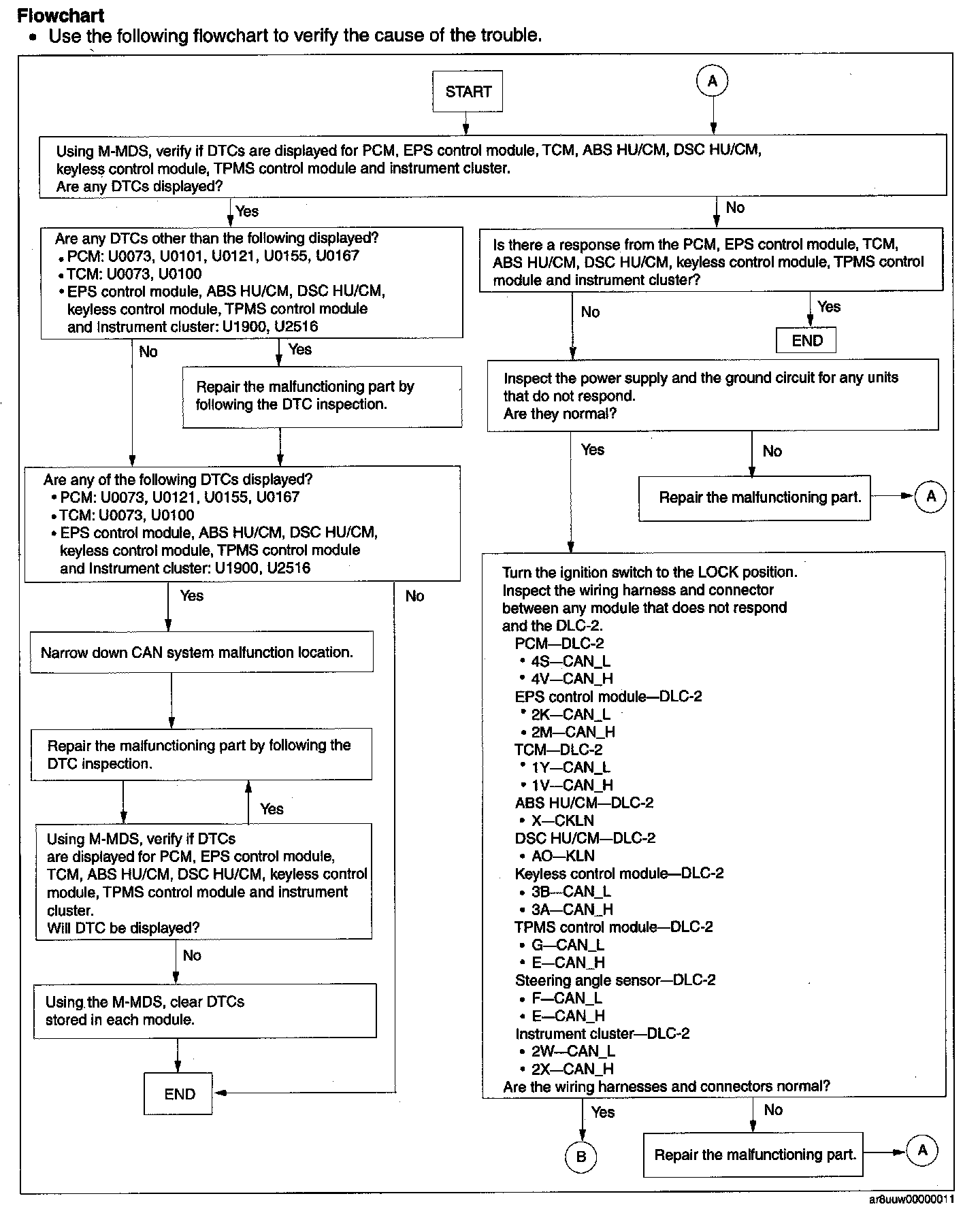 - If the controller area network (CAN) system is malfunctioning, read the DTCs of the following modules, using the M-MDS to determine the malfunctioning system.