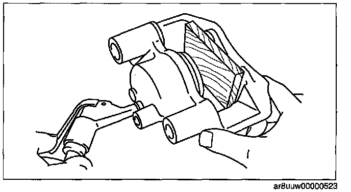 1. Insert a piece of wood in the caliper as shown in the figure, and then blow compressed air through the bleeder screw hole to remove the piston from the caliper body.