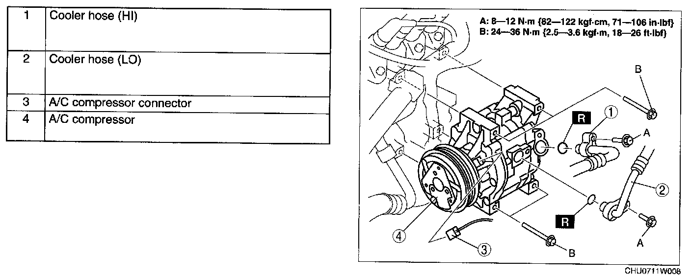 A/C COMPRESSOR REMOVAL/INSTALLATION1. Disconnect the negative battery cable. (See REFRIGERANT CHARGING.)