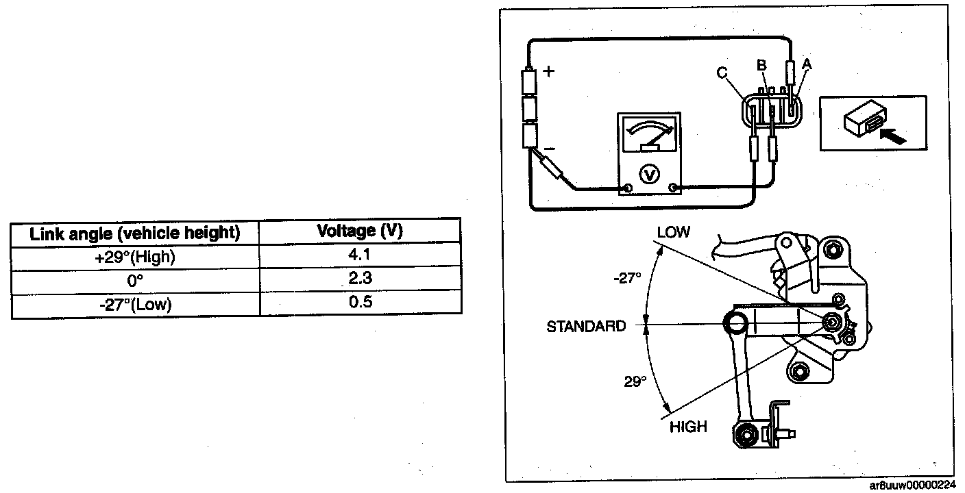 - If not as indicated in the table, replace the front auto leveling sensor.
