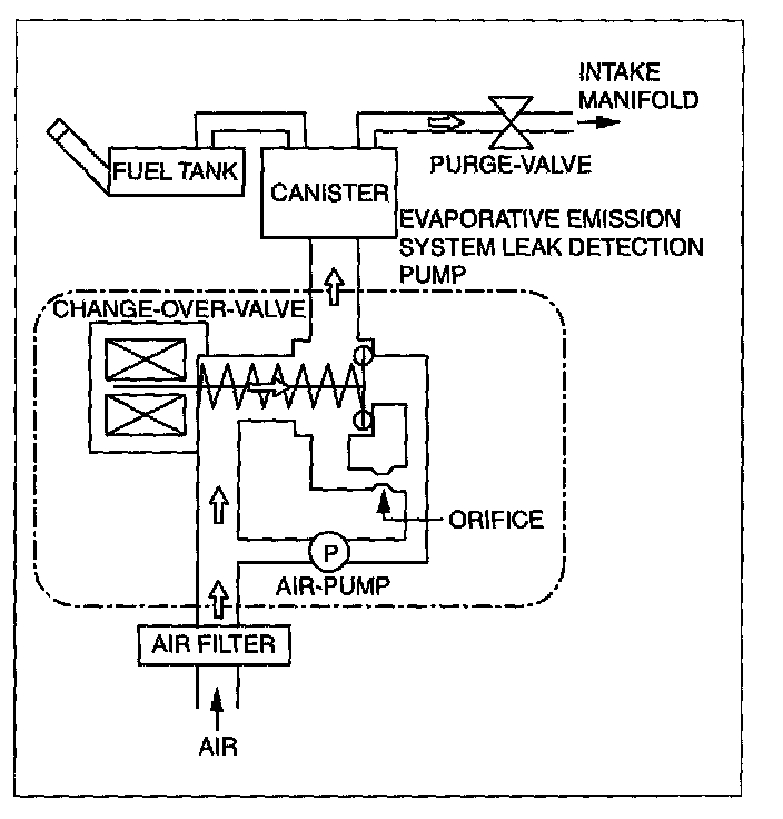 - The EVAP system test finds gas leaks in the system using the PCM to monitor changes in the air pump load current of the EVAP system leak detection pump. This test starts after sending an on-demand test signal from the M-MDS to the PCM. The PCM controls the air pump and change-over-valve operation and also stores the load current of the air pump as follows: