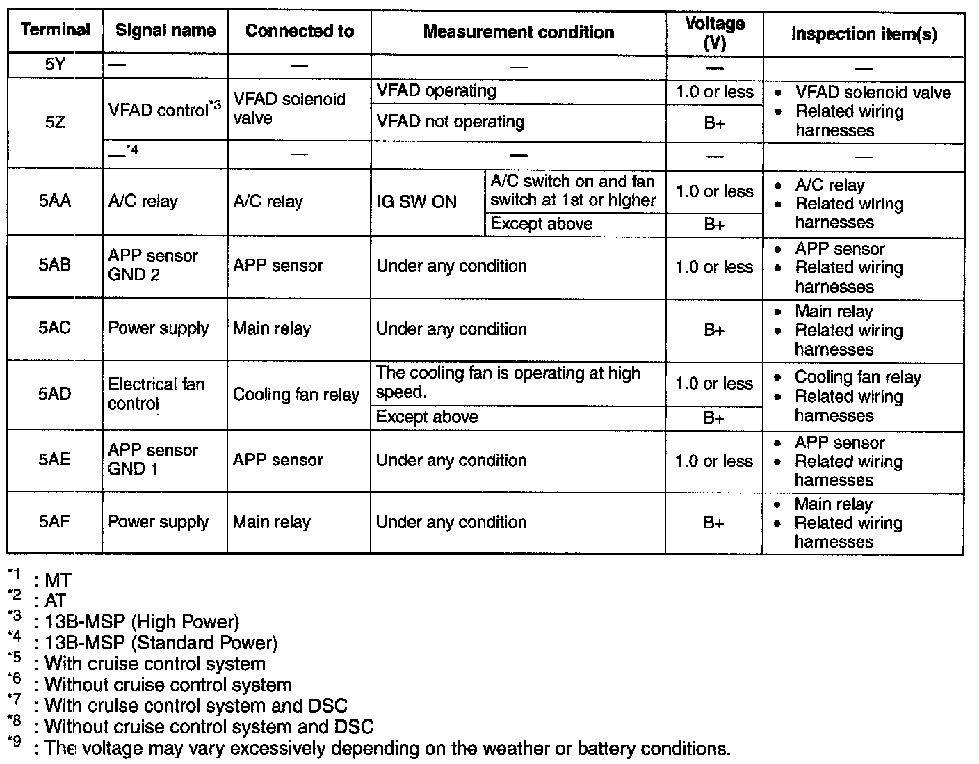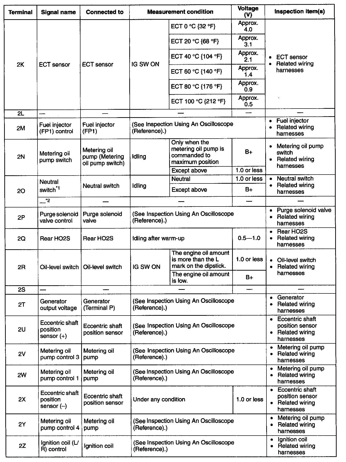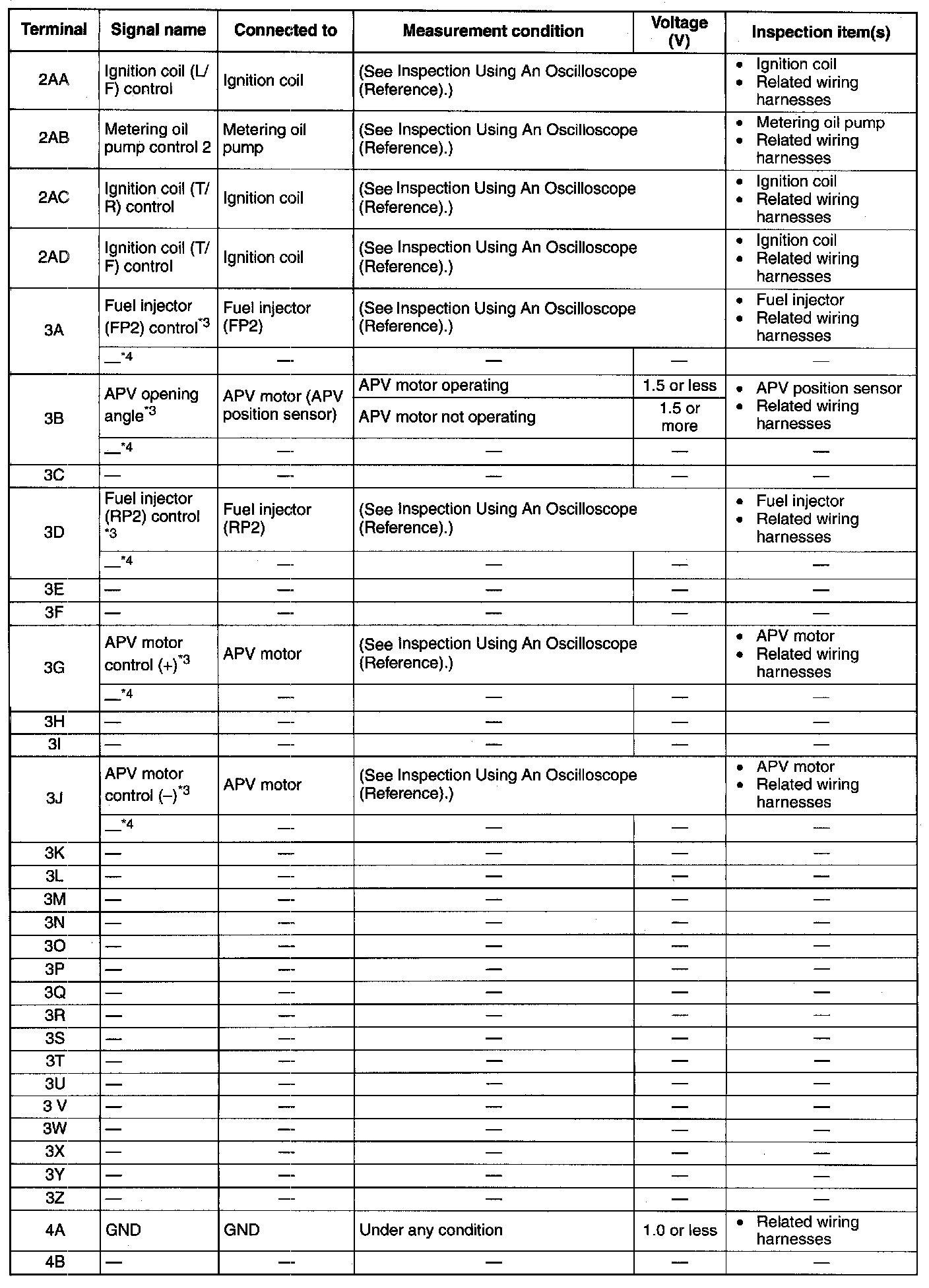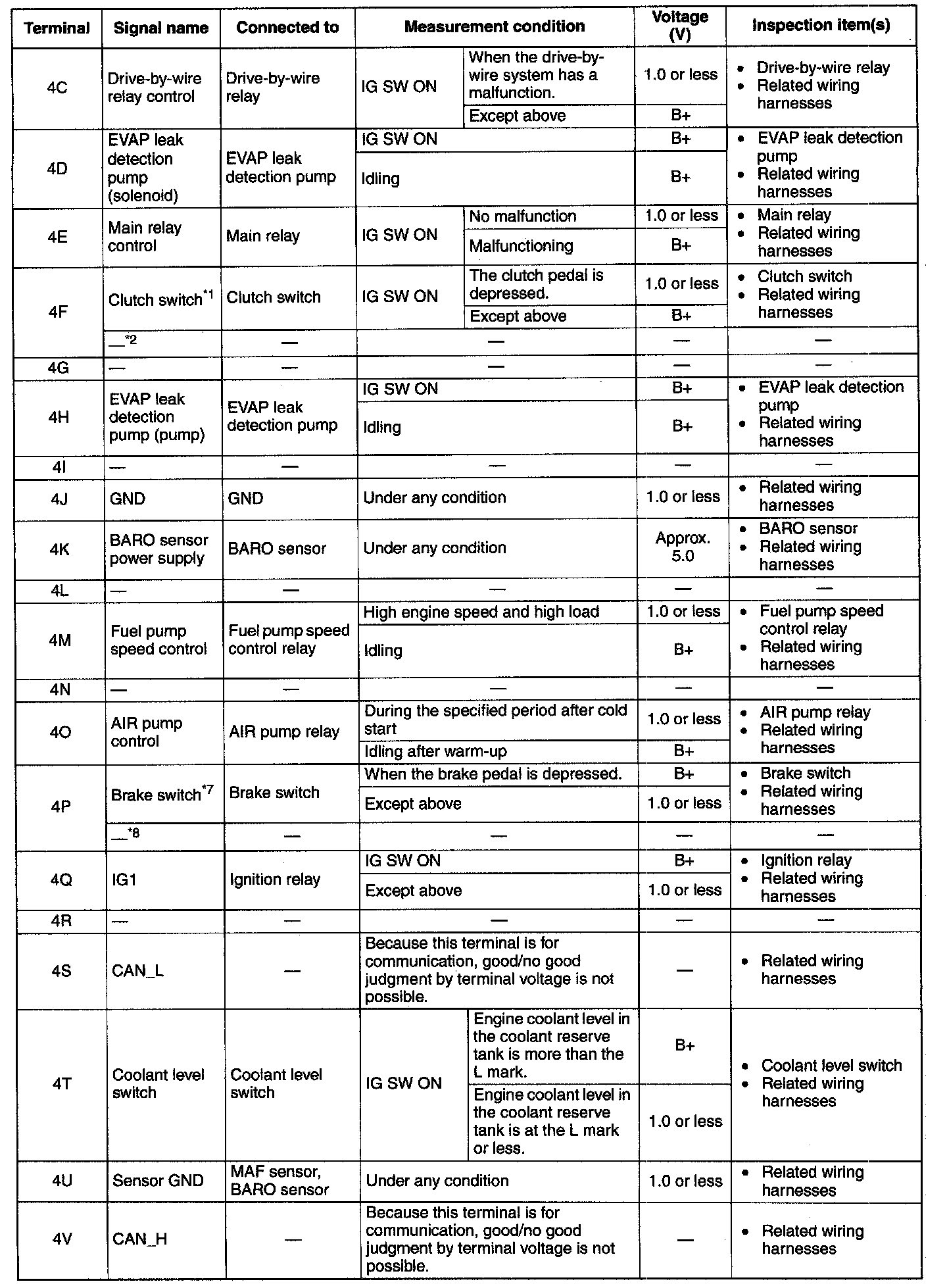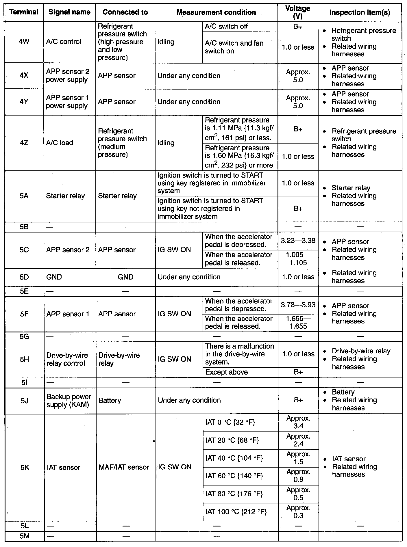PCM Terminal Voltage Table (Reference):