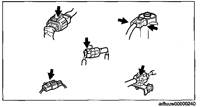 - Connectors can be disconnected by pressing or pulling the lock lever as shown.