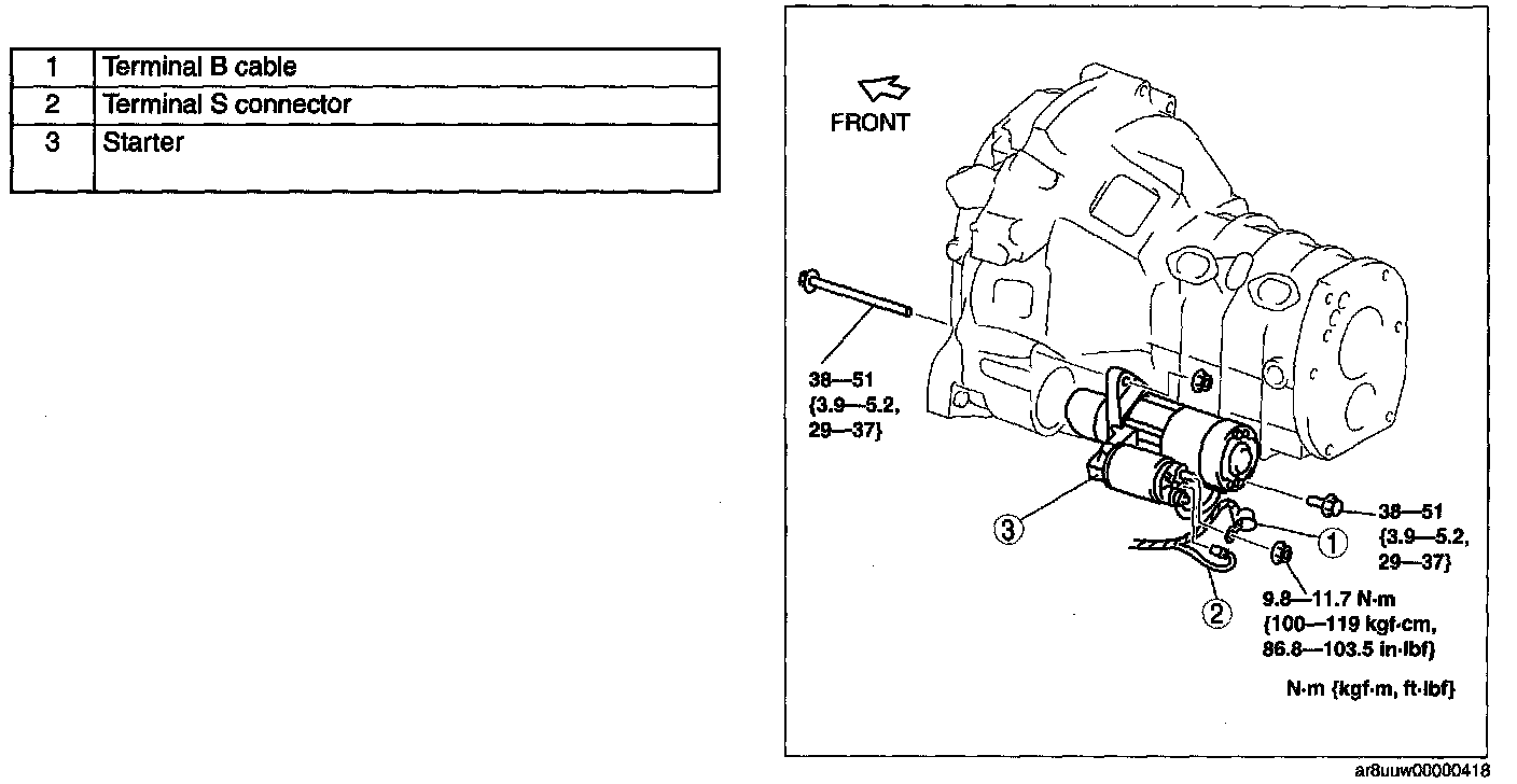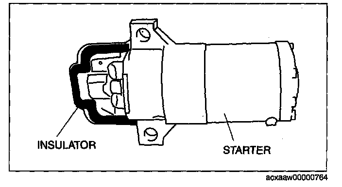 - When the battery cables are connected, touching the vehicle body with starter terminal B will generate sparks. This can cause personal injury, fire, and damage to the electrical components. Always disconnect the negative battery cable before performing the following operation.