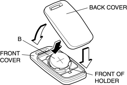 3. Install a new battery (CR2025) into the front portion of the holder with the positive pole (+) facing up. Press on the B portion of the battery to set the battery.