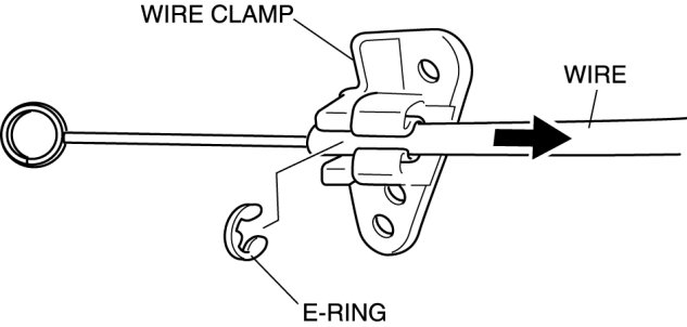 8. Remove the E-rings from the air mix wire and airflow mode wire, slide the wires in the direction shown by the arrow, then remove the wire clamps from the air mix wire and airflow mode wire.