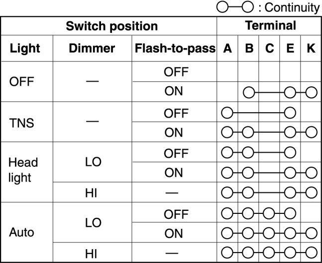 Verify that the continuity between the light switch terminals is as indicated in the table.