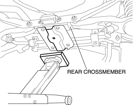 - Place a board (approx. 20 mm {0.78 in} thick) between the rear crossmember and the jack to prevent damage to the crossmember.