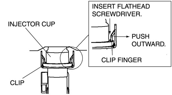 1. Insert a flathead screwdriver between the injector cup and clip finger.