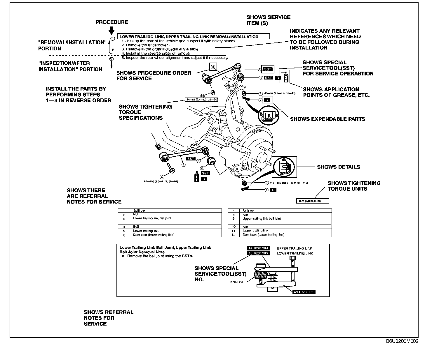 2. Expendable parts, tightening torques, and symbols for oil, grease, and sealant are shown in the overview illustration. In addition, symbols indicating parts requiring the use of special service tools or equivalent are also shown.