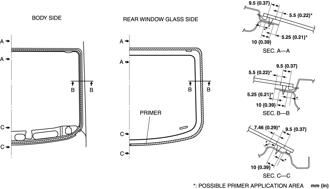 5. Apply glass primer on the rear window glass, and body primer on the rear window glass molding as shown in the figure. Allow it to dry for approx. 30 min.