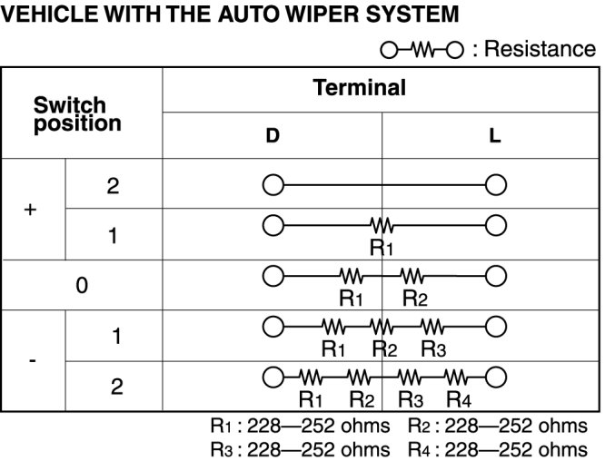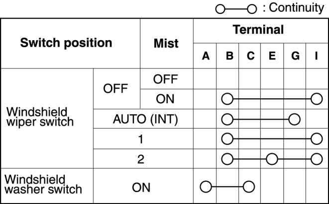 1. Verify that the continuity between the windshield wiper and washer switch is as indicated in the table.