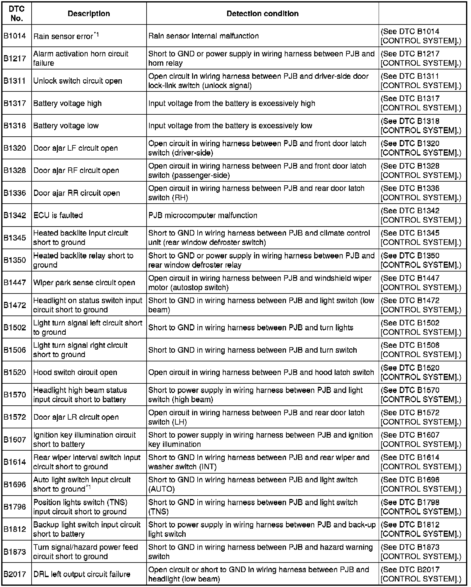 DTC TABLE (PJB) [CONTROL SYSTEM]
