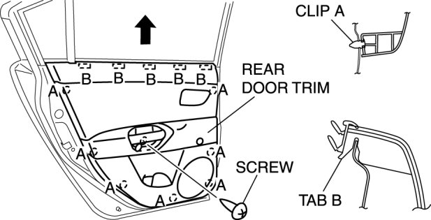 7. Pull the rear door trim upward and detach tabs B from the rear door.