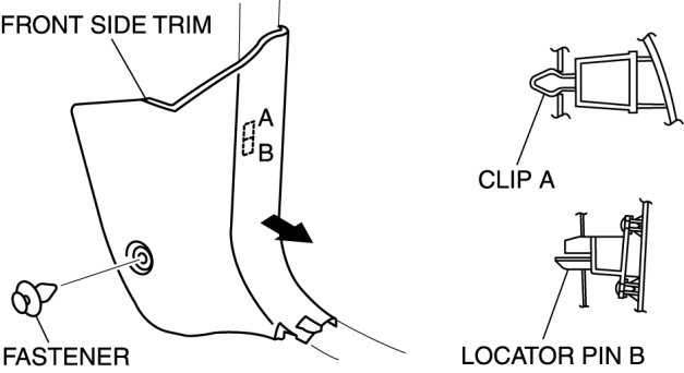 3. Pull the front side trim in the direction of the arrow and detach clip A and locator pin B.