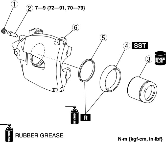- When blowing compressed air into the caliper body, the piston may pop out and cause injury if not supported at the correct point. Securely support the piston friction surface by hand when blowing compressed air.
