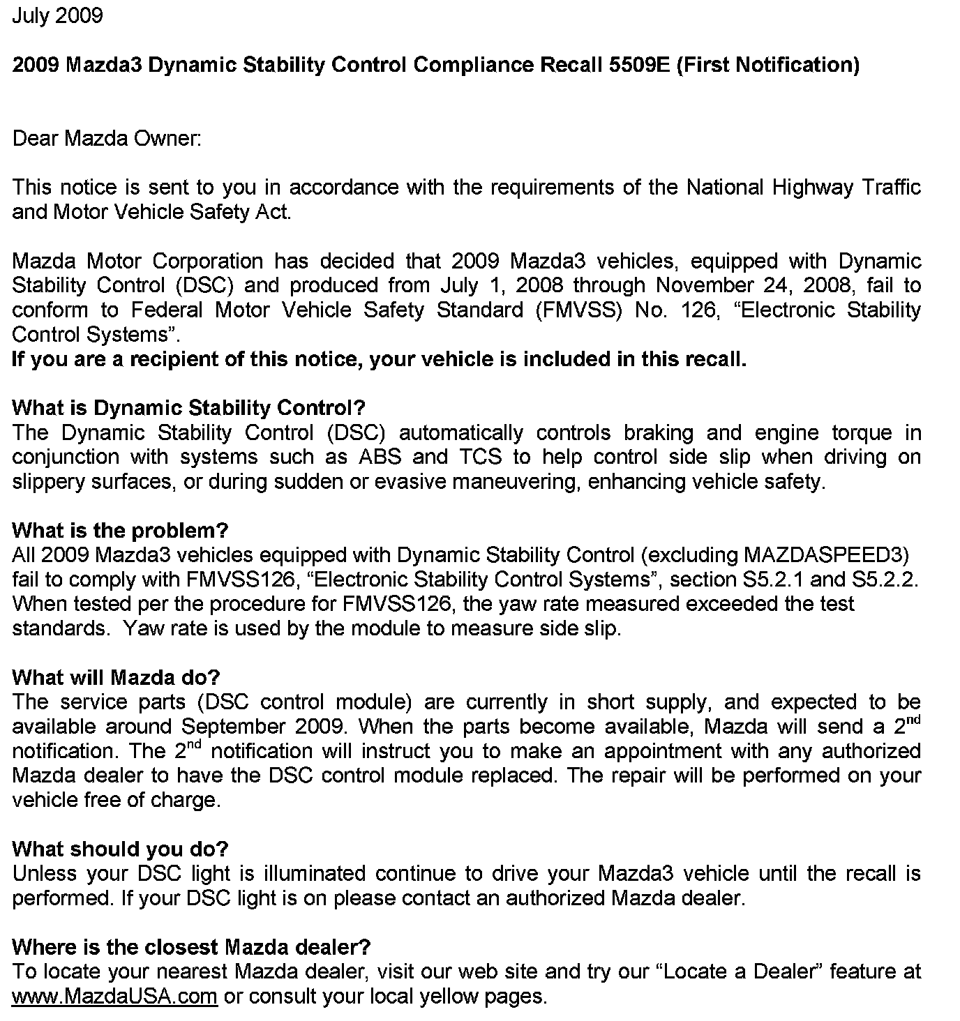 Recall - Dynamic Stability Control (DSC) Non-Compliance