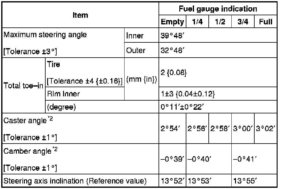 - Toe angle changes by approx. 6mm {0.2 in} per one rotation of the tie rod for one wheel.