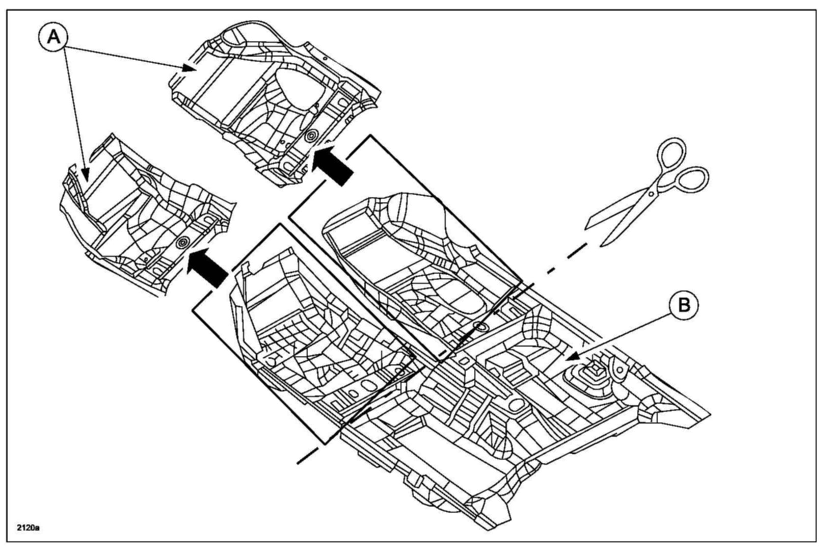 4. Cut the floor mat at the location where the No. 2 cross member is fitted, then remove the cut floor mat.