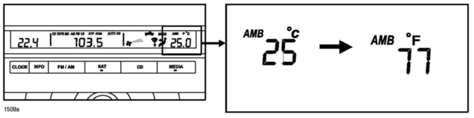 On vehicles equipped with Automatic Air Conditioning, the ambient temperature and temperature set for the air conditioner share the same location on the display. Therefore, if the ambient temperature is displayed in Fahrenheit, then the temperature set for the air conditioner is also displayed in Fahrenheit.