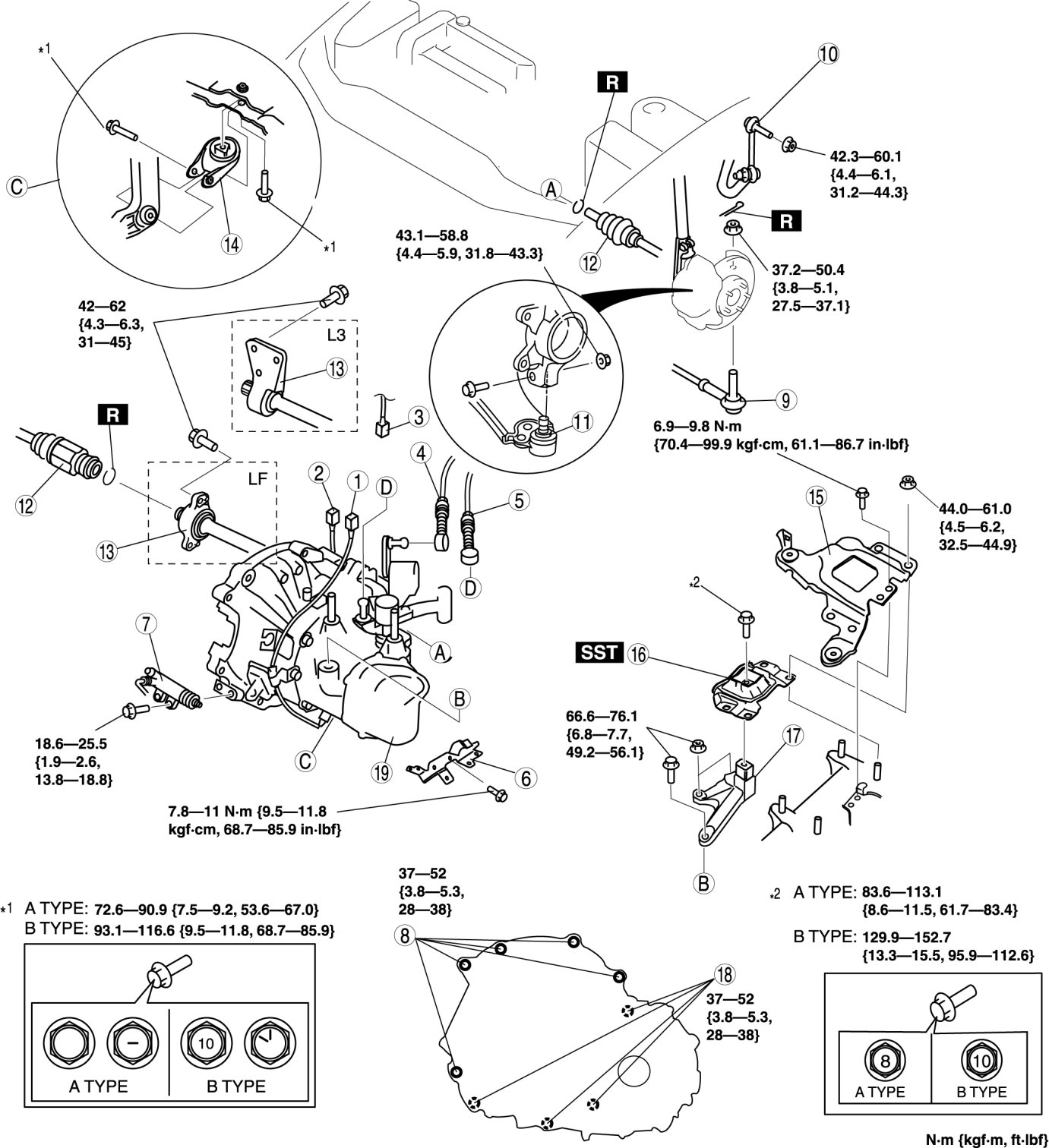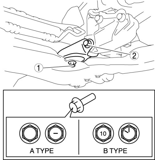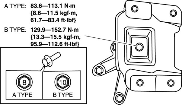 - If the engine mount rubber installation bolt is type A, replace it with type B bolt and tighten.