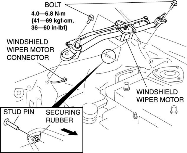 6. Move the windshield wiper motor in the direction of the arrow, remove the securing rubber from the stud pin (for connecting the motor securing rubber), and then remove the windshield wiper motor.