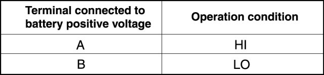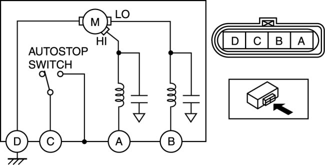 2. Connect battery positive voltage to windshield wiper motor terminal A or B, and ground to terminal D, then verify that the windshield wipers operate as shown in the table.