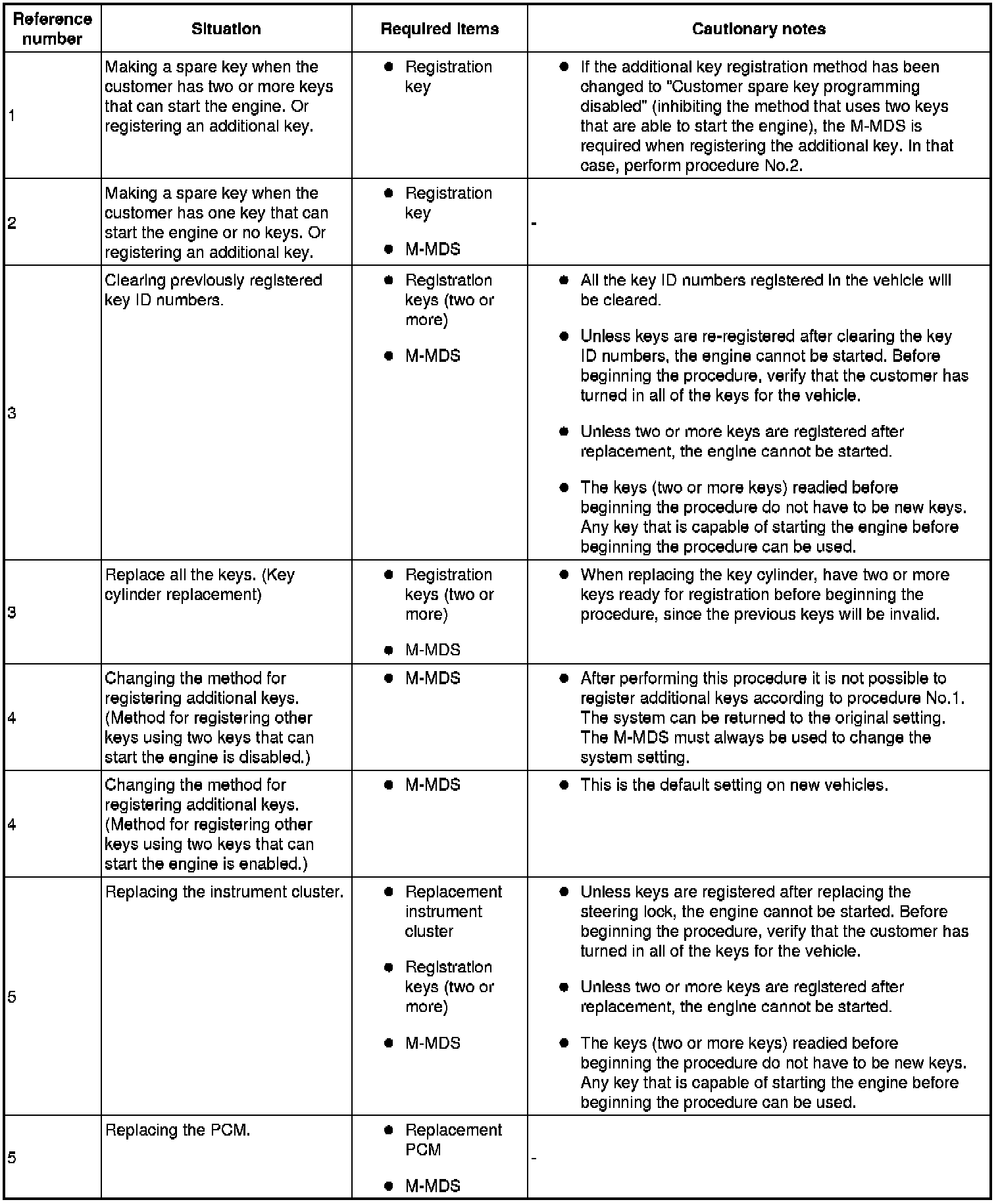 - When performing the following procedures, the immobilizer resetting procedure using the M-MDS must also always be performed: "instrument cluster replacement", "PCM replacement", "instrument cluster and PCM joint replacement", "Key ID number clearing". The engine will not start unless all work is performed using the M-MDS.