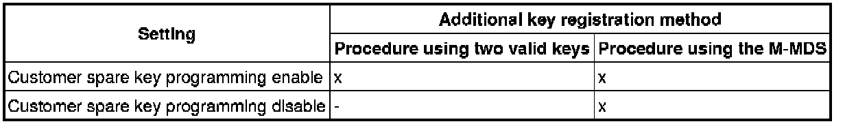 - By disabling the "No.1 Additional Key Registration Procedure (Using Two Valid Keys)", only the M-MDS can be used to register additional keys, thereby preventing two valid keys from being used to create an unauthorized spare key. This function is for use by rental car or other companies with vehicle fleets.
