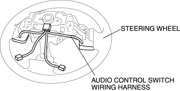 1. Install the audio control switch so that the audio control switch wiring harness passes behind the steering wheel as shown in the figure.