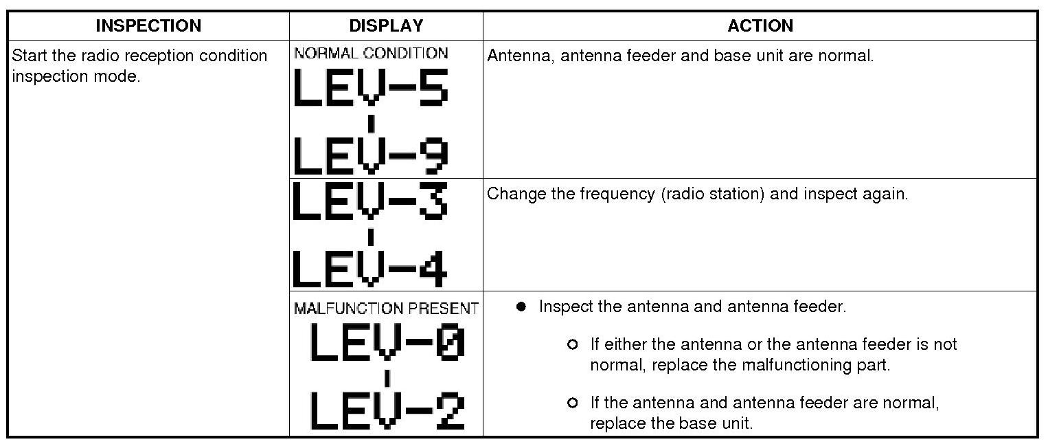 - Even if the system is normal, radio reception may be difficult depending on where the system is inspected (indoors/outdoors, or conditions at the location). Before inspecting the system, verify that radio reception is adequate.