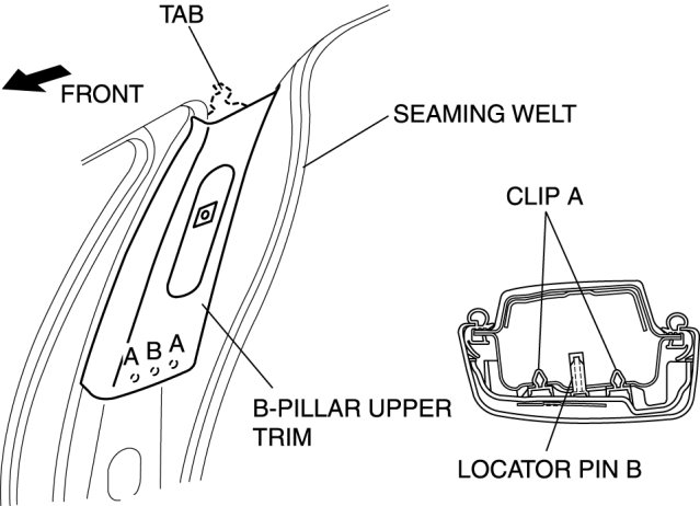 3. Pull the B-pillar upper trim outward and detach clips A and locator pin B.