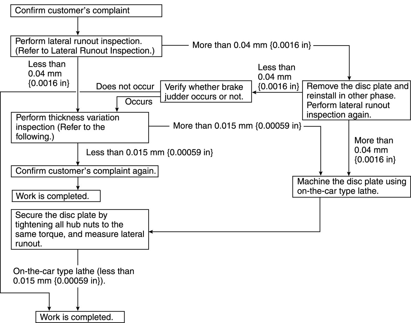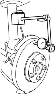 1. If the runout is more than 0.04 mm {0.0016 in} at the position 10 mm {0.39 in} from the disc plate edge, uneven wear occurs on the disc plate because the pad contacts the plate unevenly.