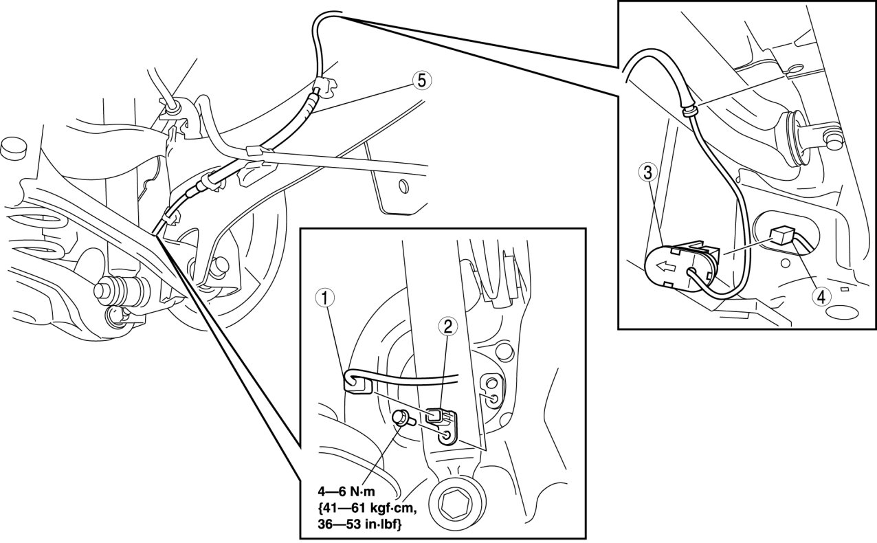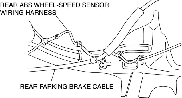 1. Pass the rear ABS wheel-speed sensor wiring harness outside the rear parking brake cable as shown in the figure.